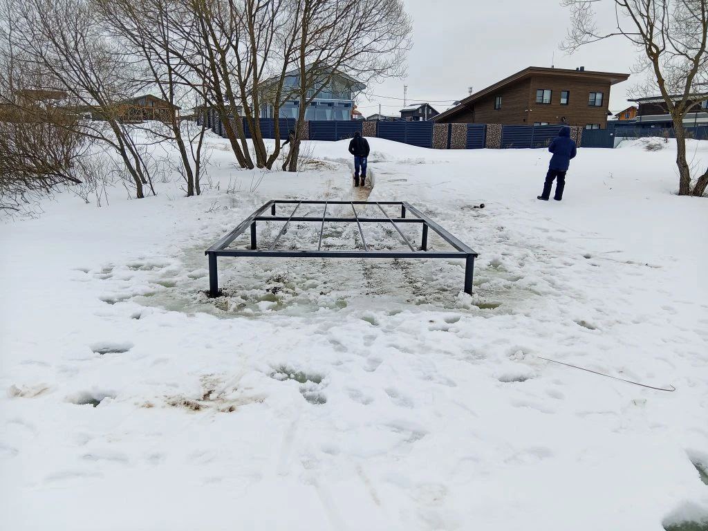 Процесс начался с тщательной разметки территории согласно проектной документации. Учитывая специфику прибрежной зоны и зимние условия, наши мастера произвели аккуратное бурение ледяного панциря в 6 точках. Это критически важный этап, так как малейшее отклонение при разметке на воде может привести к перекосу всей конструкции. Использование специализированного оборудования позволило нам подготовить лунки нужного диаметра, сохранив при этом целостность окружающего льда для безопасного передвижения монтажной бригады.