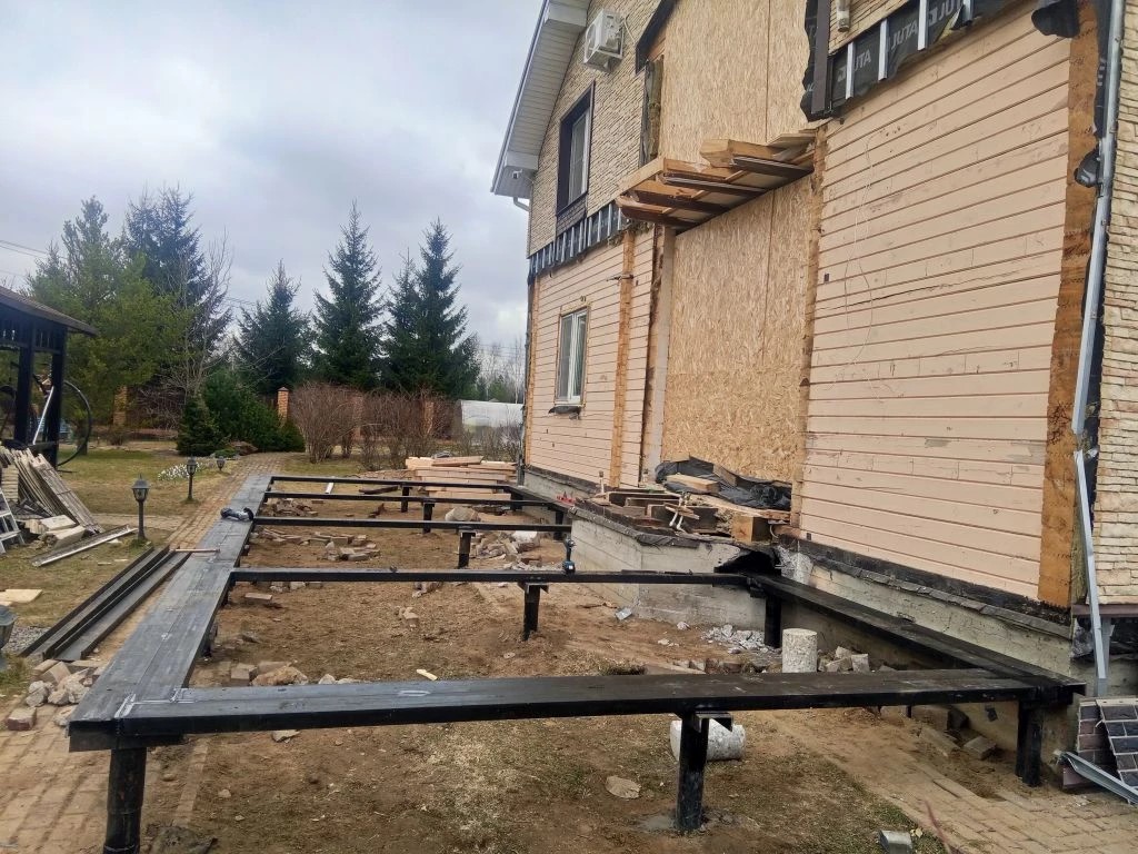 —Фундамент для будущей веранды-оранжереи из 15 винтовых свай и двух швеллеров под стены из бревна