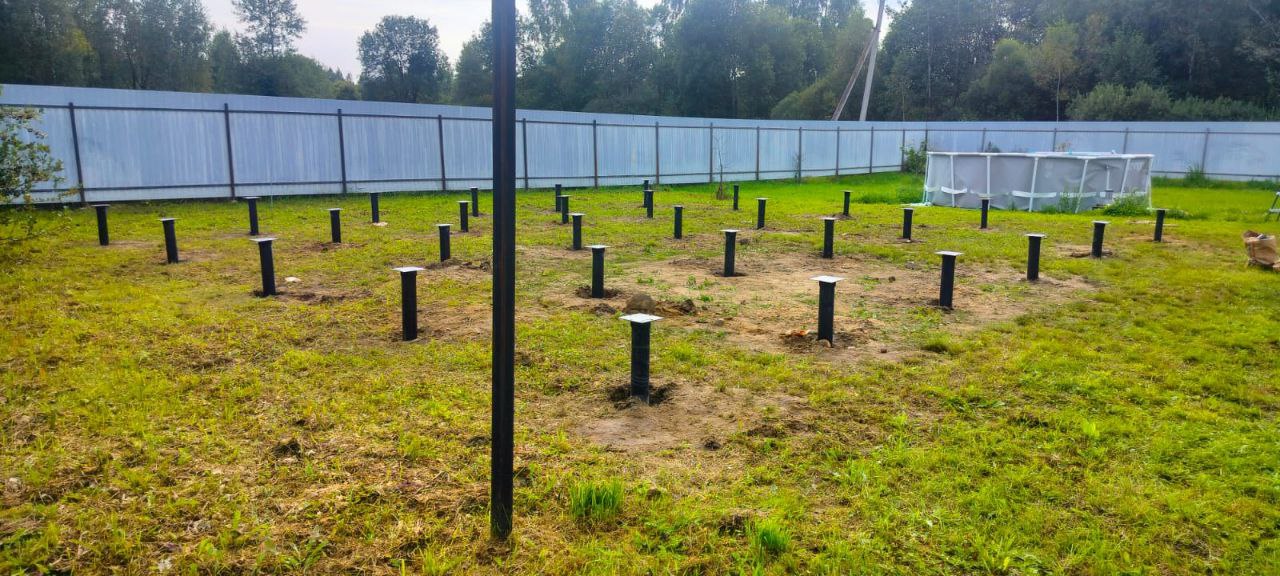 После установки свай на каждую из них были закреплены оголовки. Этот этап крайне важен, так как оголовки служат опорой для будущей обвязки фундамента. Правильная установка оголовков гарантирует, что дом будет иметь ровное и прочное основание.